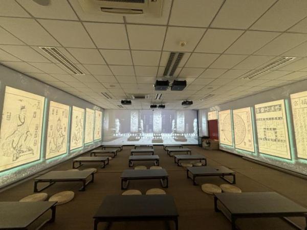 “医心史志”全景沉浸式体验教室位于搜书吧 A座5楼,自楼梯间开始便为建设部分,古风场景为同学们营造沉浸式氛围。主体教室采用360度全景投屏营造沉浸式效果,目前教室可容纳90人以内的班级进行课程使用。已有3部自制中医体验场景(中医历史大事记、火与灸、针灸铜人)以及多个与传统文化相关的体验场景(如春夏秋冬、千里江山图等)以供使用,并逐渐投入到中国医学史、中医文献学、中医古籍美学赏析等课程中。