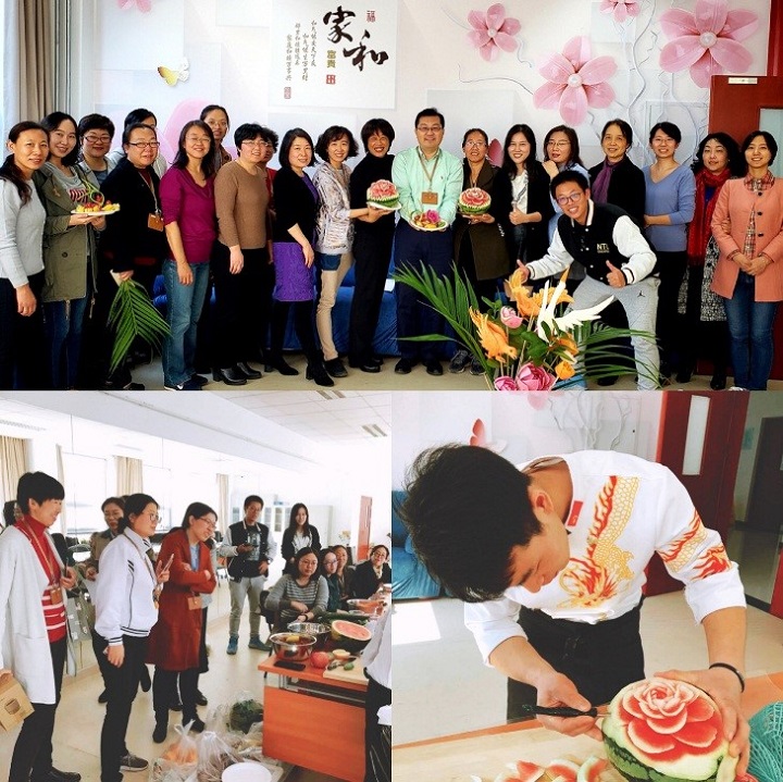 首先,由雕花技师为老师们展示自己精湛的雕花技巧,雕出了栩栩如生的西瓜牡丹和萝卜仙鹤供老师们欣赏。随后,雕花师傅分别为老师们教授了苹果飞鸟、圣女果兔兔、西瓜雕刻、蓑衣黄瓜、橙子雕塑等实用雕刻及拼盘技巧。靓丽的果拼让老师们看得跃跃欲试,很快进入角色,不一会就雕刻出了自己的作品。最后,雕花师傅又展示了更高难度的蒙眼雕花技巧盲雕仙鹤,获得了大家一致赞叹。