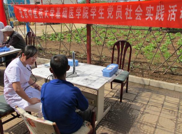为了深入贯彻落实科学发展观,坚持服务社会, 2010年5月31日,基础医学院20余名党团干部和学生骨干前往怀柔区红螺老年公寓,开展“基础医学院学生党员社会实践活动“。当日上午,学院党总支副书记杜伟带领学院资深教师和高年级学生在红螺老年公寓院内开展义诊服务,义诊共持续2个半小时,为公寓内近30名鳏寡孤独残障老人提供了健康咨询、诊病、量血压等服务。党员同志们在为老人送去健康知识和医疗服务的同时,也为他们送去了慰问品和衷心祝福。同时学院还组织学生对当地村民的健康状况进行了调查,并将把调查结果作为下一次实践活动的重要依据。