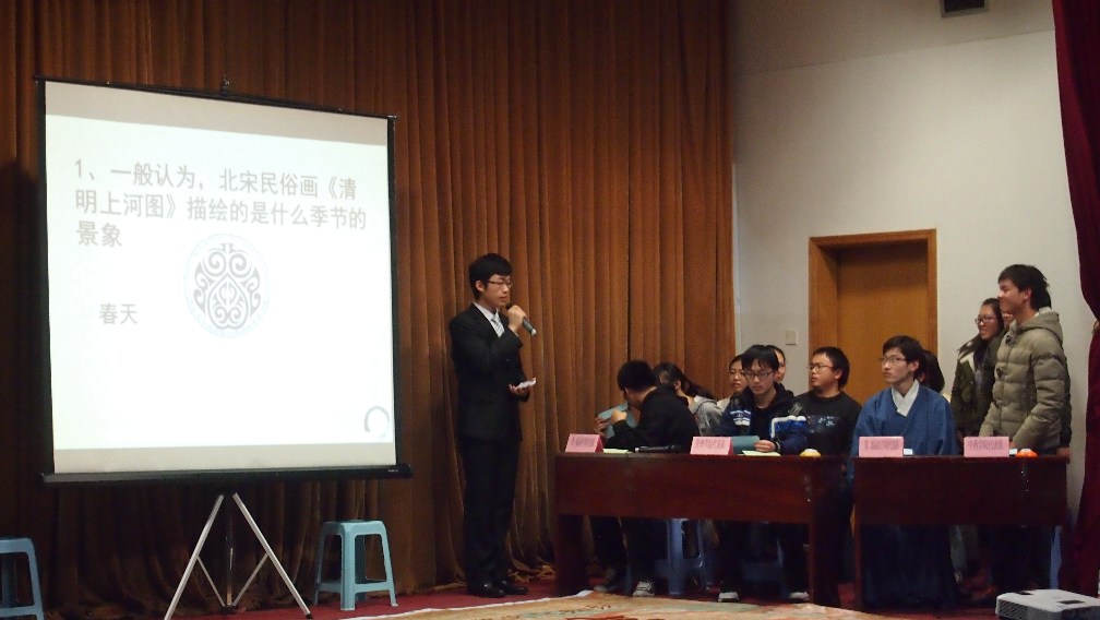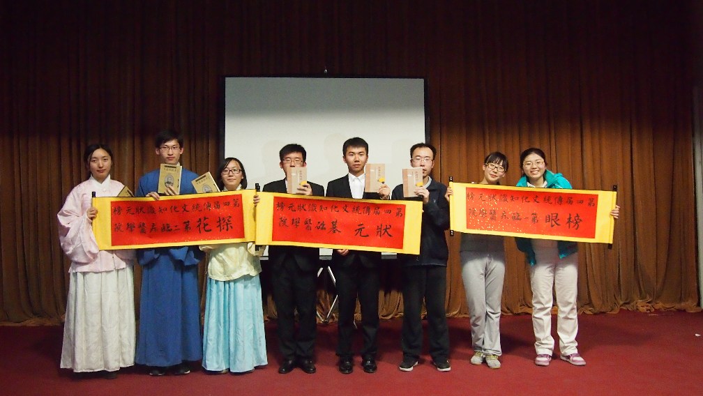 赛分为三个环节:分道扬镳、战国时代、秦皇一统。考查的内容全面广泛,从诗词、曲乐、习俗、历史等多个方面出题,更加考验选手们对中国传统文化是否有广泛的接触和扎实的积累。其中第一环节分为两部分,首先是“经典互动”,即选手与场下亲友团互动背诵抽取的经典典籍,由评委老师打分。各参赛队伍与其亲友团背诵得流畅纯熟、声音洪亮、抑扬顿挫,使现场气氛不断高涨。随后是“厚积薄发”,即每支队伍抽取一组题目,每组三题,每名队员必须且只能回答一题。第二环节“战国时代”采取一战到底的形式,由守擂方和攻擂方抽题作答。题目颇具难度,涉及知识面较为宽广,台上选手斗志斗勇,沉着应对,台下观众紧张而又认真地观看,不时地为选手们的精彩回答鼓掌。第三环节“秦皇一统”采取抢答形式,各队选手聚精会神,不敢丝毫掉以轻心,现场气氛更是紧张激烈。其中的乐曲辨析题尤为精彩,由表演者现场弹奏,不仅让观众享受到了美妙的乐曲,也反映出我校学生的多才多艺。全场气氛热烈而活泼,台上选手紧张作答,台下不时爆出阵阵掌声。在各个环节评委打分期间,学习部还特别设计了观众答题环节,并送出奖品。观众们答题踊跃,掀起赛场一个又一个高潮。最后基础医学院代表队以总分第一名成绩获得“状元”桂冠,第一临床代表队和第二临床代表队分别以第二、三名成绩,荣获“榜眼”与“探花”。