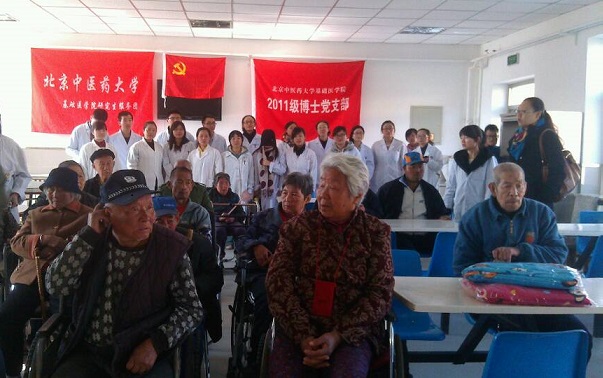 2013年10月26日,基础医学院2011级博士支部、2013级博士支部、2012级硕士支部以及本科第二支部,至怀柔镇敬老院联合开展敬老爱老中医健康卫生服务活动。活动由11级博士支部的支部书记赵娜老师带队,四个支部共26名党员骨干、积极分子参加。