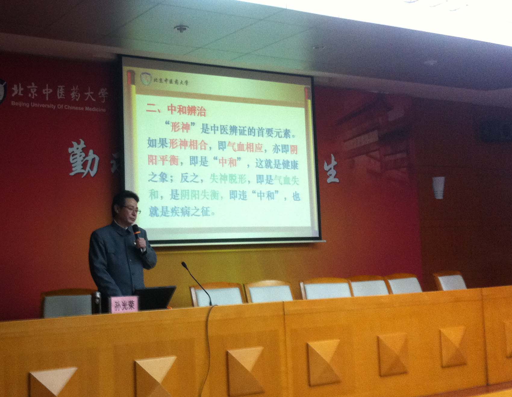 孙老从名老中医学术思想和思辨特点以及“中和思想·中和辨治·中和组方”两个方面展开了讲座。孙教授以“感恩北中医、热爱北中医、服务北中医、效力北中医”作为讲座开篇,认为研究名老中医学术思想是有高度、有深度、有广度的科研动作,继承者必须从侍诊和研读典型医案入手,领悟原创、追索本源、求证验案,才能发现名老中医的学术思想。继承创新名老中医学术思想必须认知原创新、确保真实性、突出实用性。他通过蒲辅周、路志正、李济仁、张琪等几位老先生学术思想的凝炼过程介绍了名老中医学术思想必须来源于中医药经典和临证经验,而不是临摹经典名言或局限于一己之经验。名老中医的临证思辨特点,是名老中医在长期临证实践中形成的独具特色的诊疗思辨着力点,在名老中医学术经验的总结中具有核心地位,在名老中医学术经验传承中具有启迪作用。对名老中医的临证思辨特点的认知要掌握思辨特点的原创思维、探讨独特的临证思辨经验。